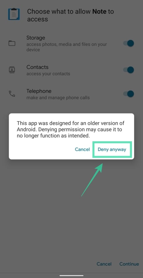 You may choose to deny the permission you don’t feel you will need the app to have, you may toggle it off. And then select Deny Anyway.