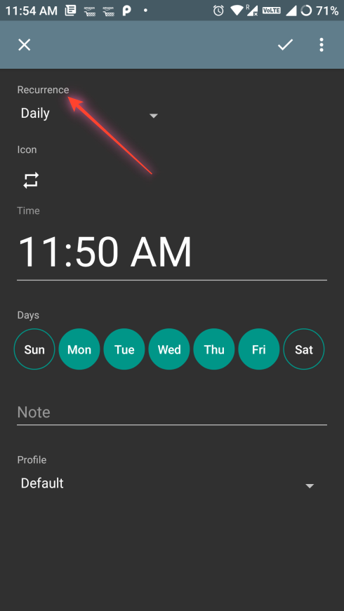 Step 3: Choose the recurrence of the alarm from the top left side.