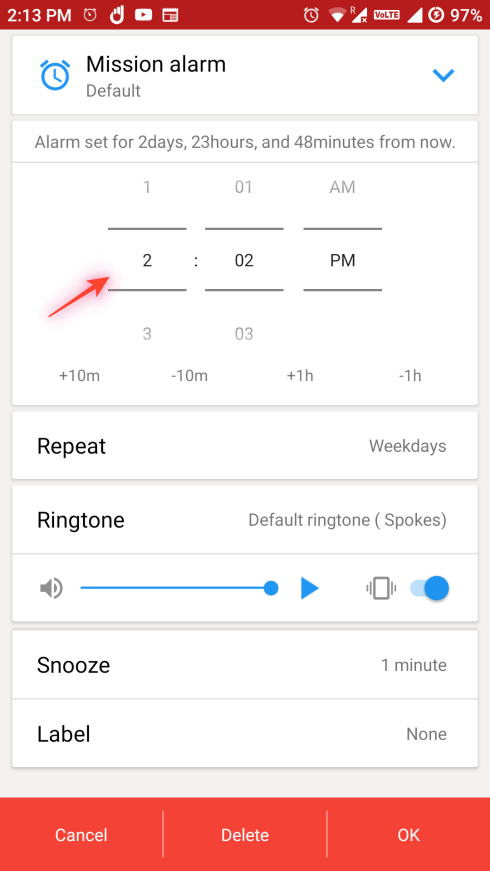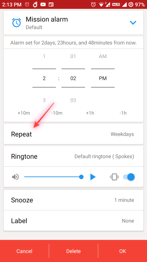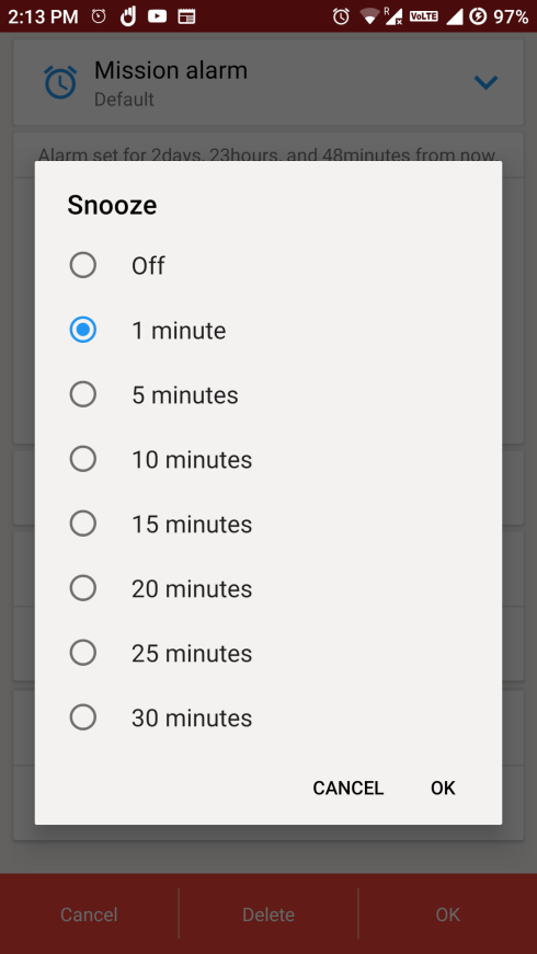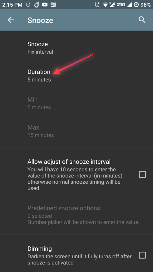 Step 6: Select the Snooze duration next. The largest snooze duration is fixed at 30 minutes BTW.
