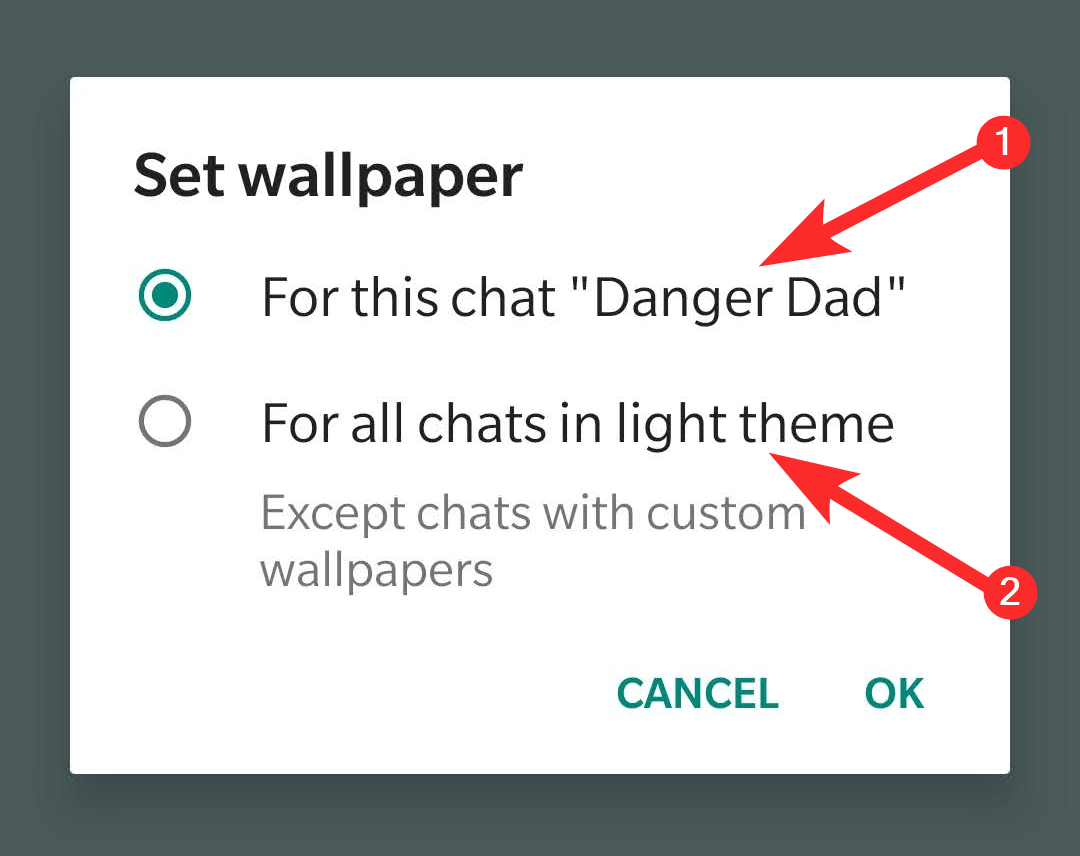 Clicking the Set Wallpaper option will give you the choice to set that wallpaper for that particular contact or for all the chats in the light theme. If you select “For all the chats in light theme” then all chats except for the ones with custom wallpapers will have the new selected background.