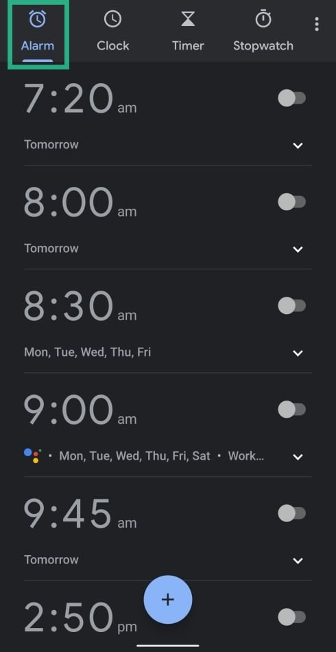 Step 1: Open the Google Clock app. Tap the Alarm tab at the top if it’s not already selected. Inside this tab, you can create a new alarm by tapping the Plus button at the bottom or select an alarm from your current list and expand it by tapping the arrow below it.