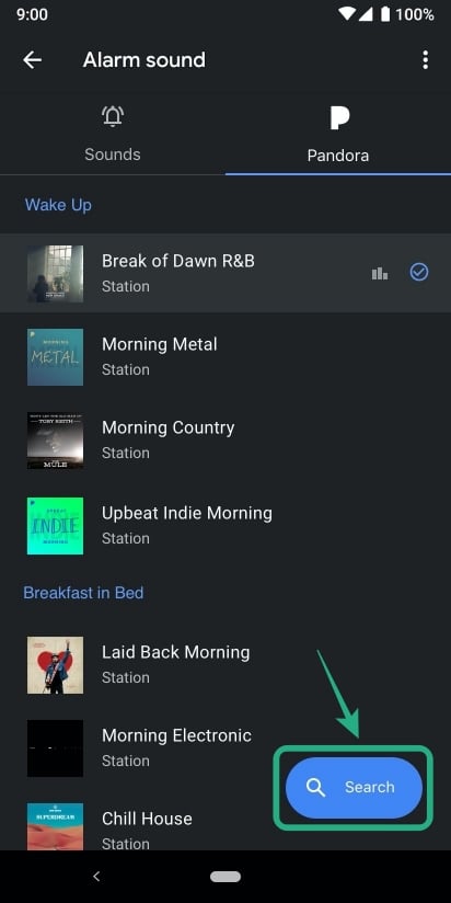 Step 3: You can select a recently played station or one of the Pandora recommendations for early morning jams to use as your alarm sound. You can also look for your favorite station by selecting the search icon on the bottom of the screen.