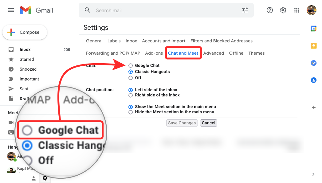 Under ‘Chat and Meet’, select the ‘Google Chat’ option inside ‘Chat’. Before your selection, ‘Classic Hangouts’ will be selected by default.