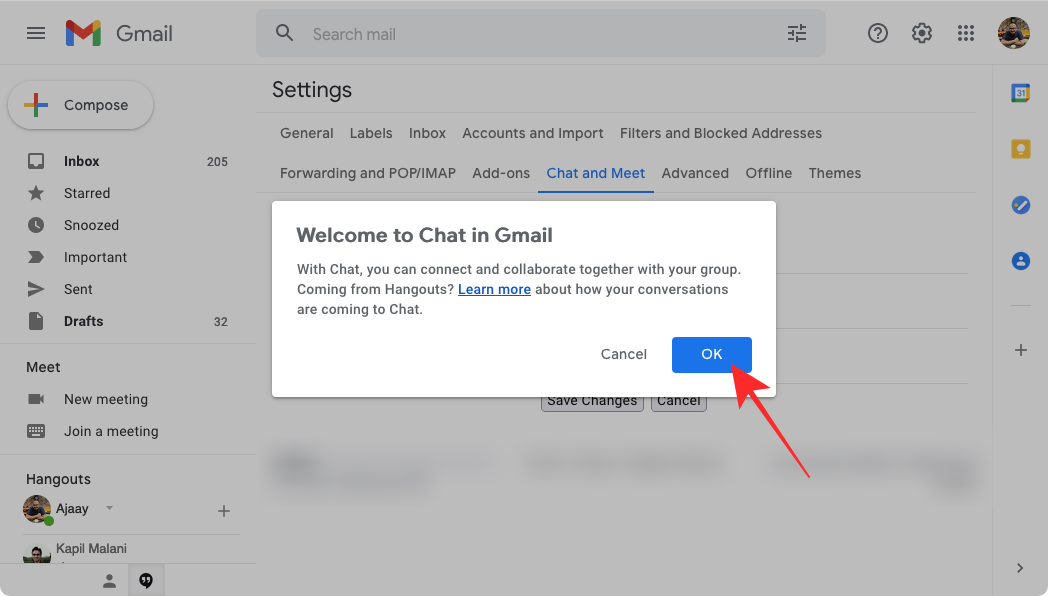 You will be prompted with a dialog that reads “Welcome to Chat in Gmail”. To confirm your switch to the new “integrated workspace”, click on ‘OK’.
