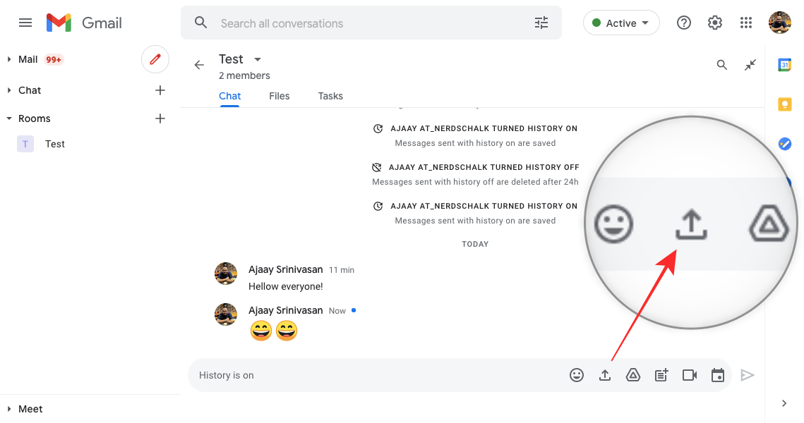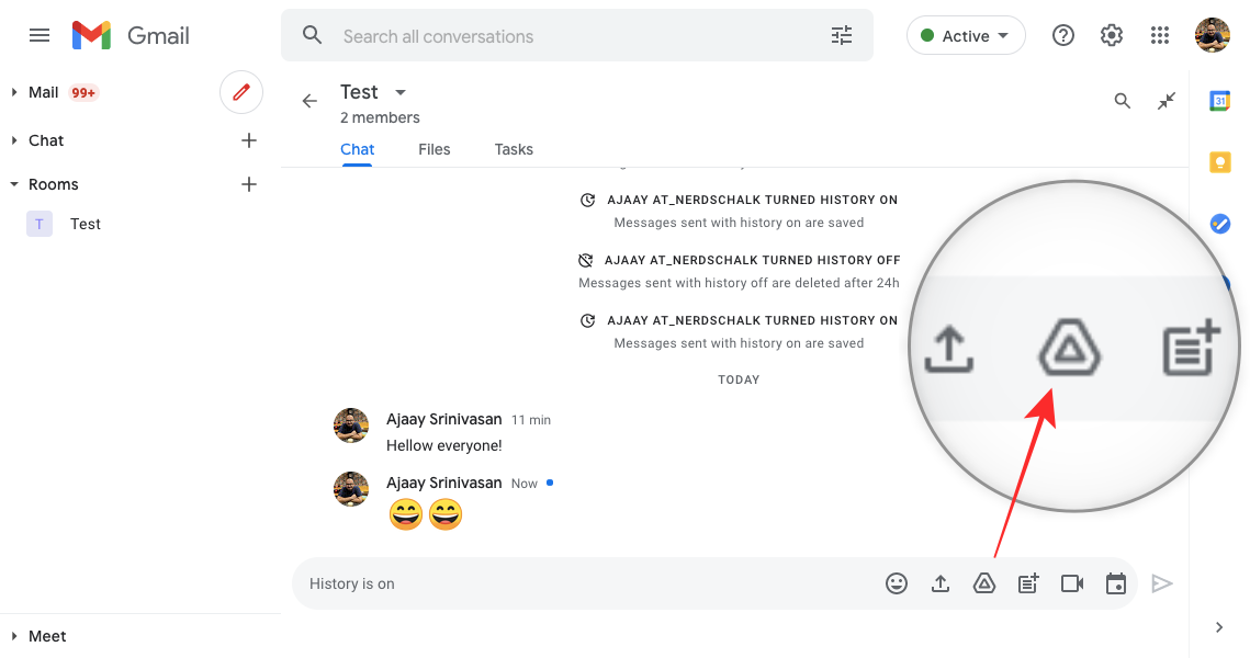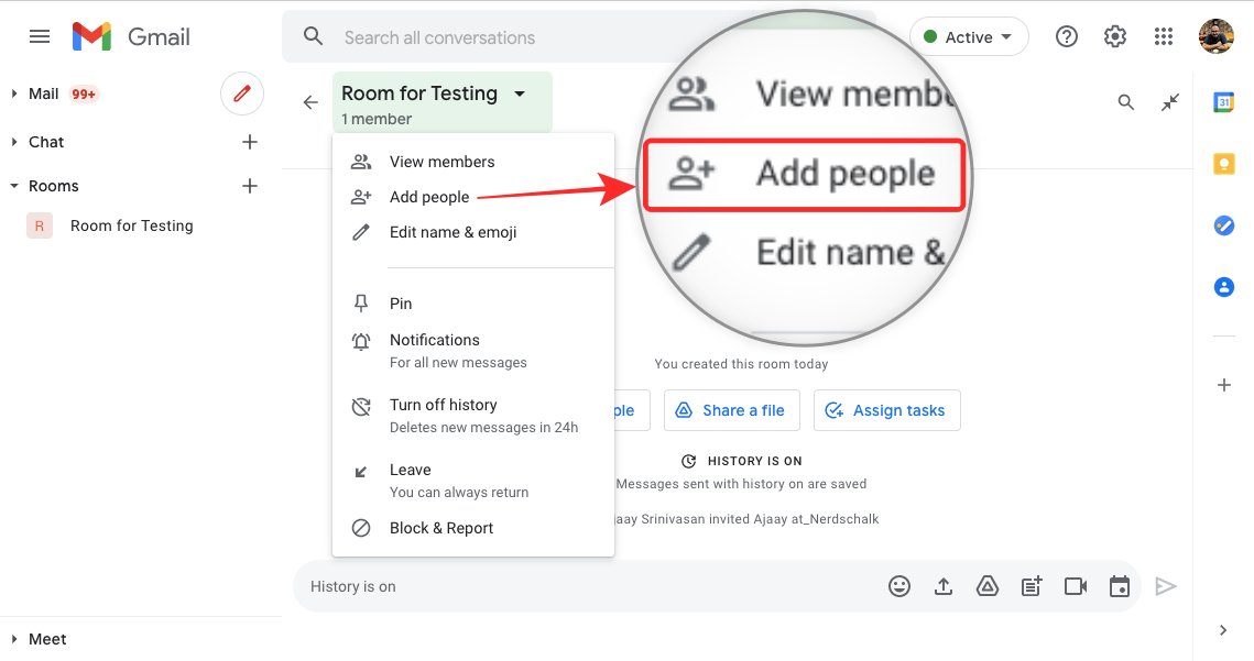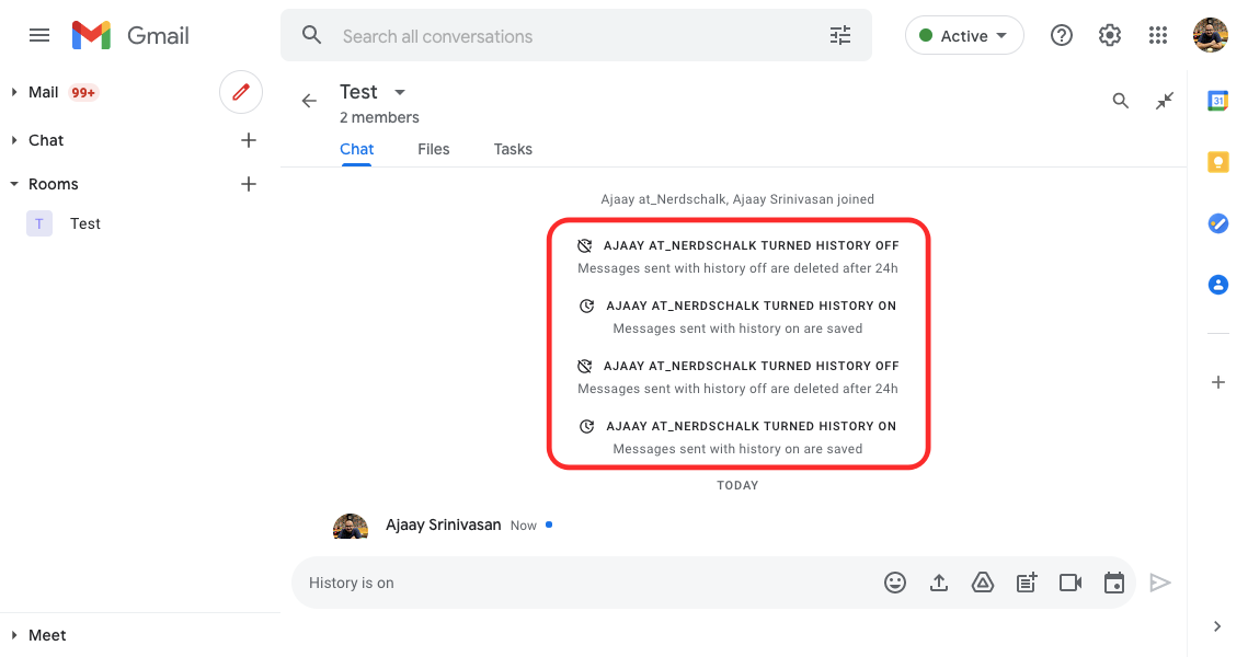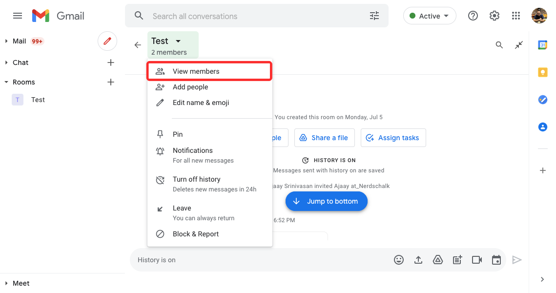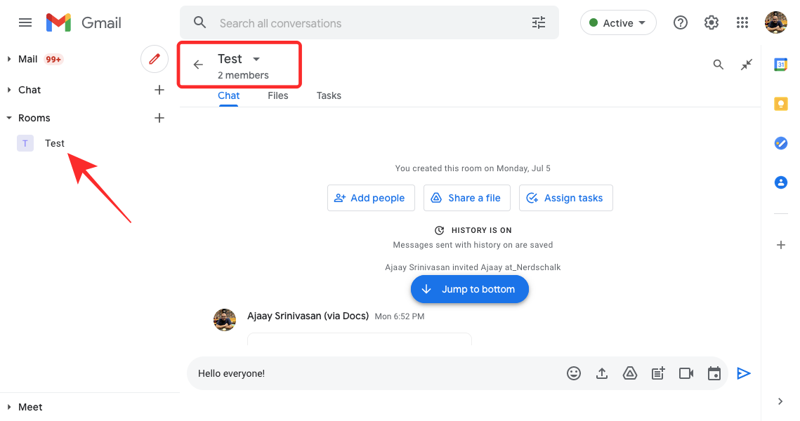 To toggle Message history on Spaces, enter a Space on Gmail or Google Chat. Inside a Space, click on the Space name at the top.