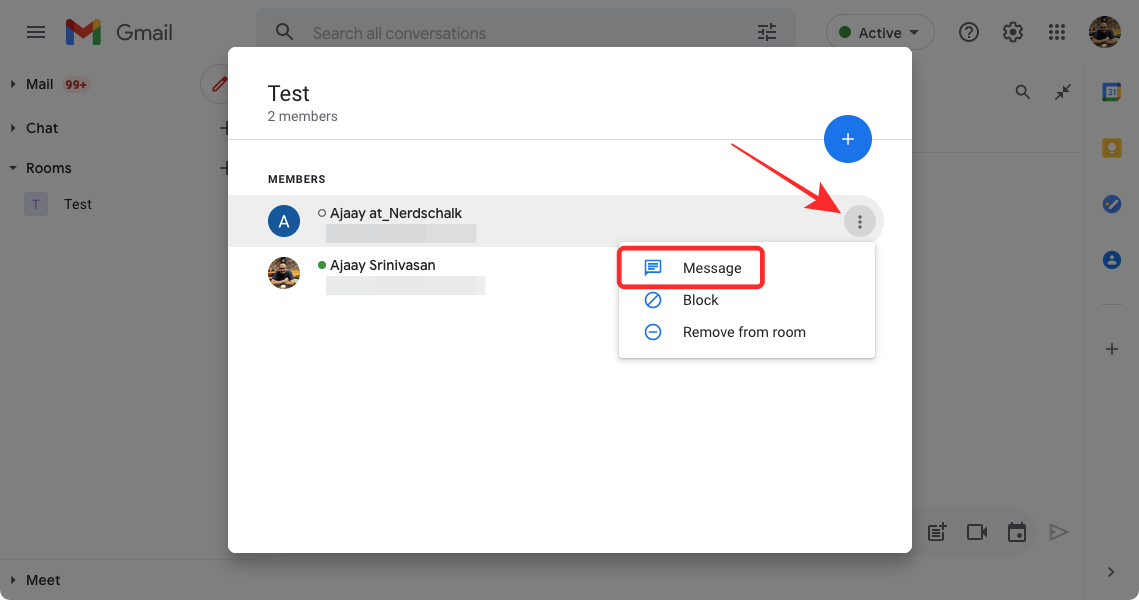 You should now see a list of all members in the Space appear inside a dialog. Here, hover over the person’s name you want to send a text to and click on the 3-dots icon on the right. In the next menu, select the ‘Message’ option to start a private conversation with the selected person.
