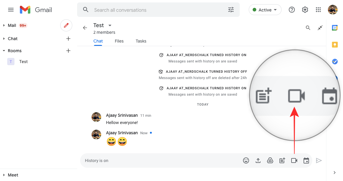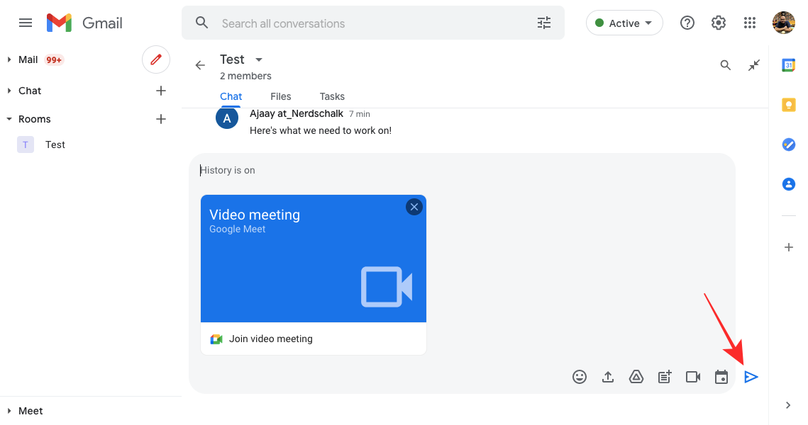 Google Spaces all lets you start a Google Meet call directly from a Space so that you can work together with others while being in a video call with them at the same time. To start a Google Meet call, enter a Space and click on the Camera icon from inside the text field at the bottom.