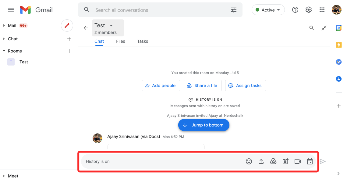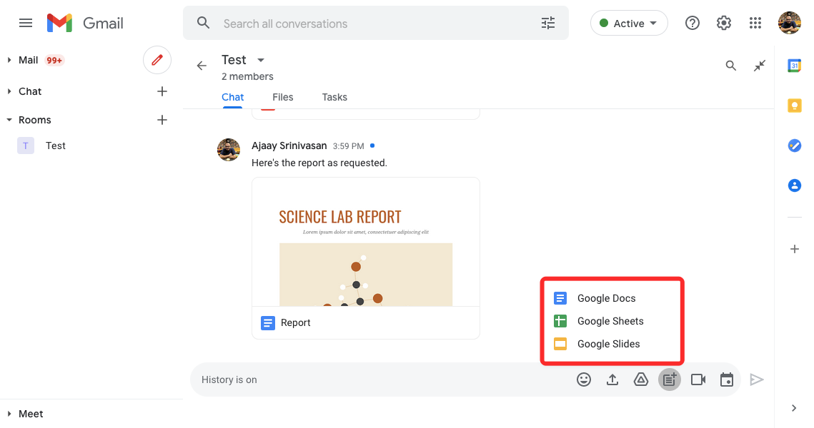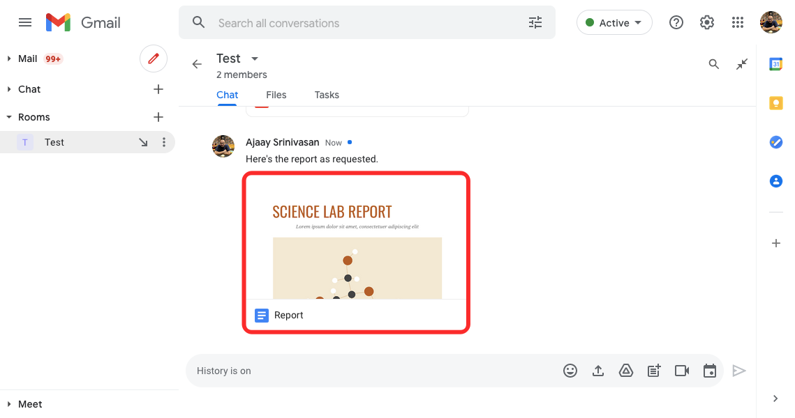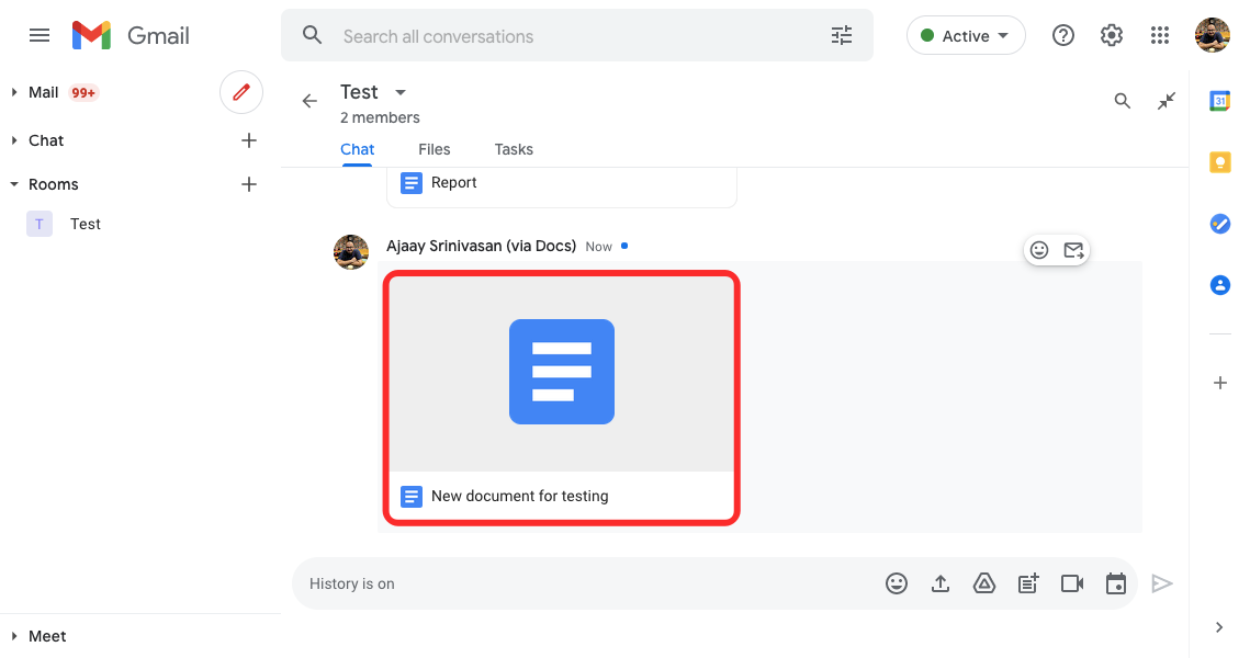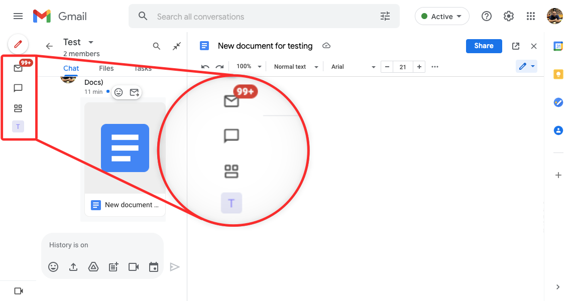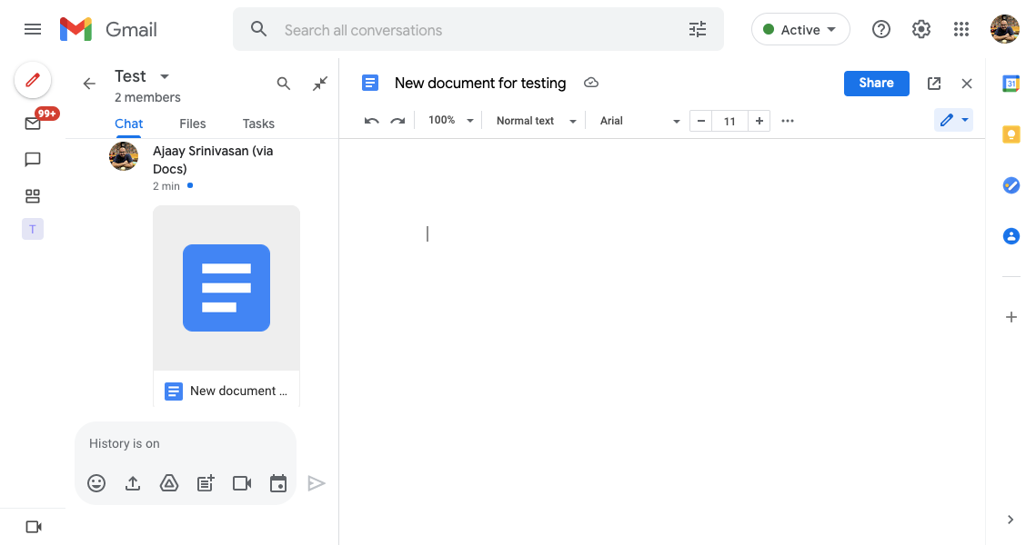 When such a document is opened, you should see the new interface inside Gmail that now loads up the document on the right and shows your active Google Chat thread on the left. Another significant change comes in the form of your Google Chat status, which is now easily accessible on the top right corner of the Gmail window. By default, it will label you as “Active” with a green icon but you can quickly switch to “Do not disturb” or “Away” to minimize distractions.