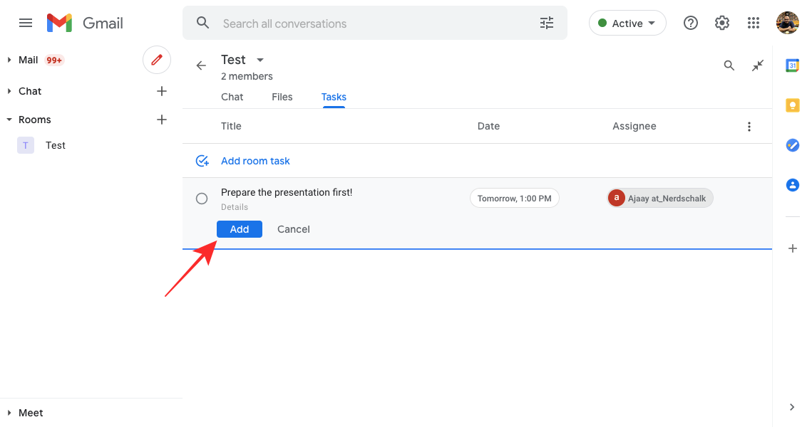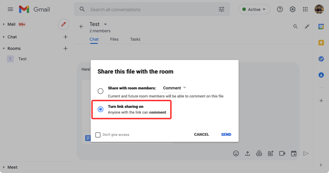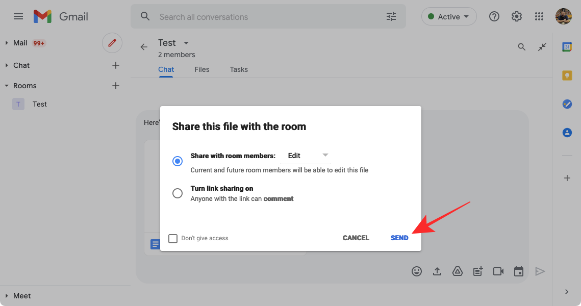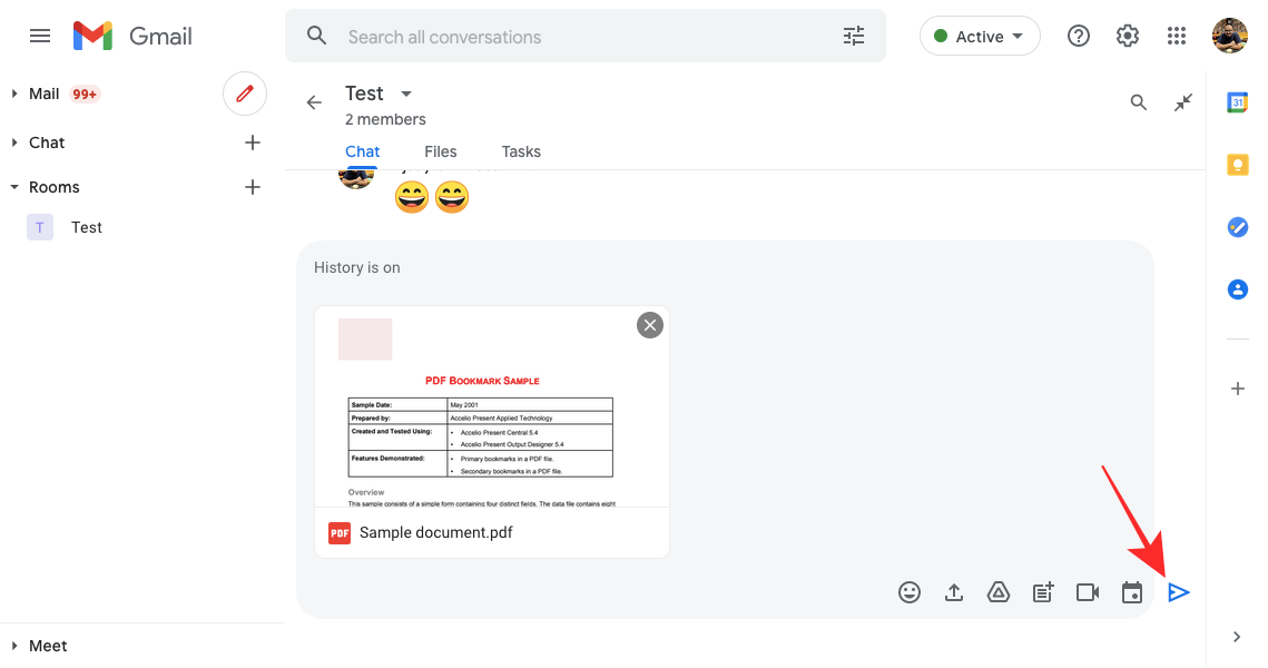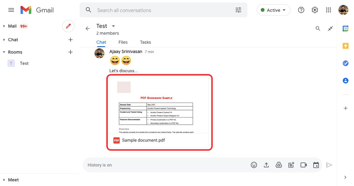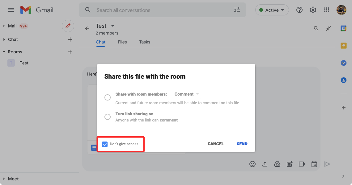 When such a document is opened, you should see the new interface inside Gmail that now loads up the document on the right and shows your active Google Chat thread on the left. Another significant change comes in the form of your Google Chat status, which is now easily accessible on the top right corner of the Gmail window. By default, it will label you as “Active” with a green icon but you can quickly switch to “Do not disturb” or “Away” to minimize distractions.