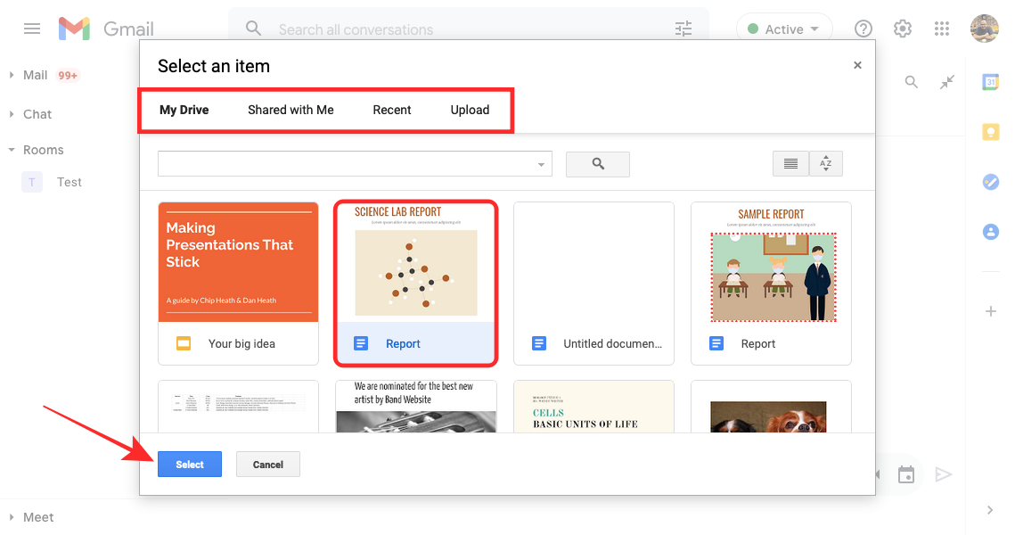 Once you’ve made your selection, click on the ‘Select’ button on the bottom left corner of the Drive popup.