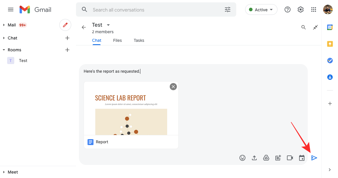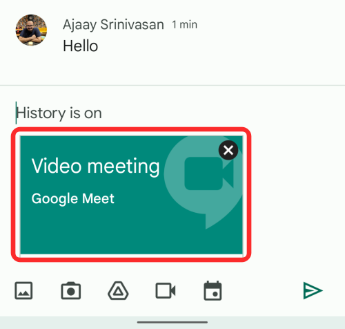A Google Meet preview will now appear on the screen. You can share the meeting link with others in the Space by clicking the Send icon at the bottom right corner.