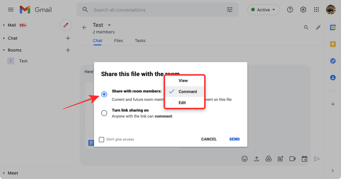 In a dialog box that appears next, you will now be asked to manage the permissions you want to assign for the file that you’re sharing. Select how other members can interact with your file by selecting one (between View, Comment, and Edit) under ‘Share with Space members’ if you wish that the file remain available only to people present in the Space.