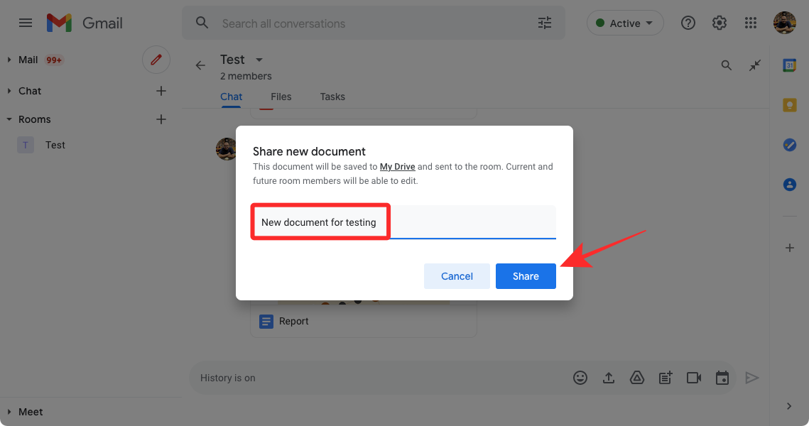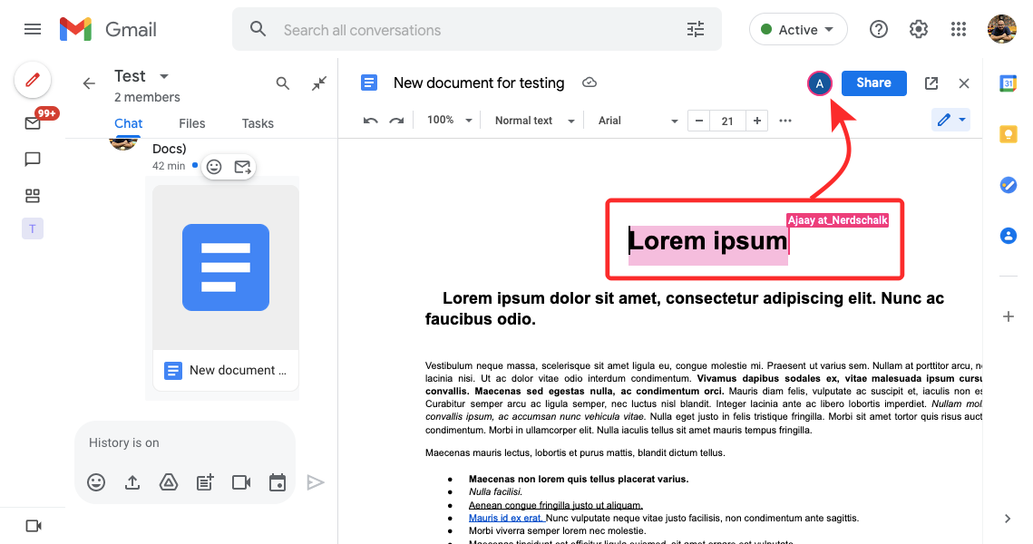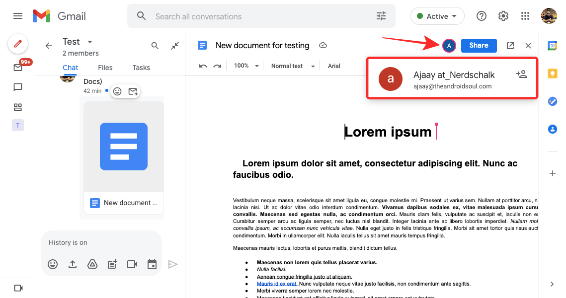 Others can access the shared document inside their Gmail or Google Chat screen by entering the Space and clicking on the document you created. When someone in your Space is taking a look at a document at the same time as you are, you will be able to see their account picture at the top right corner of the screen next to the ‘Share’ button. When you hover over their name, you should see their name and email address in an overflow bubble below it.