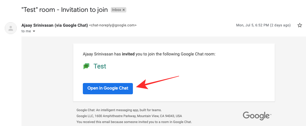 When the mail opens, you should be able to see your invite and who sent it to you. To join the Space you’ve been invited to, click on the Open in Google Chat option inside the invite.