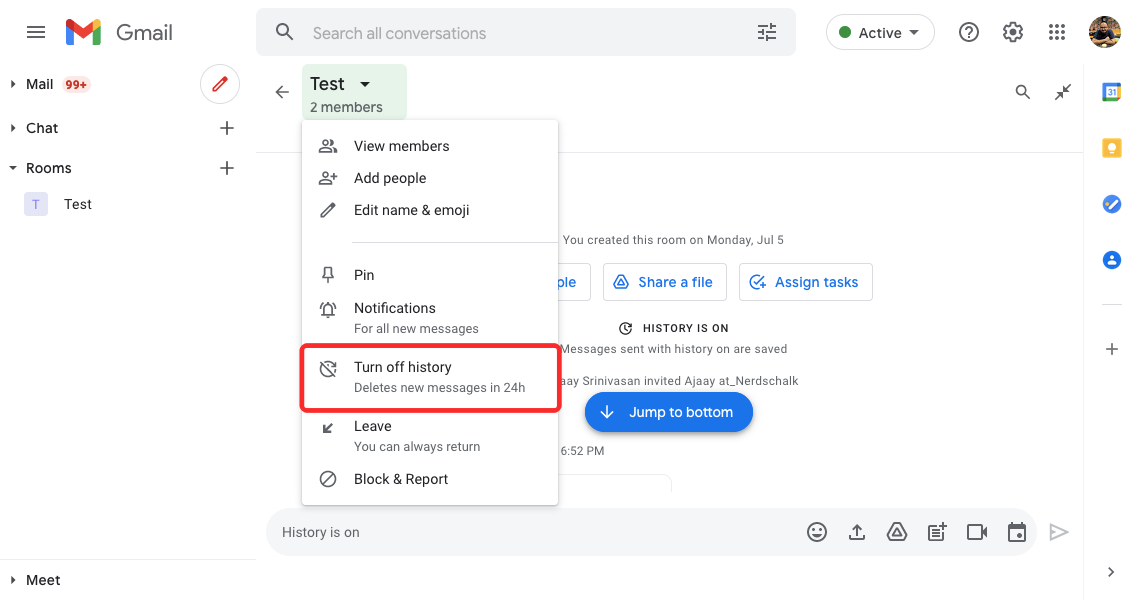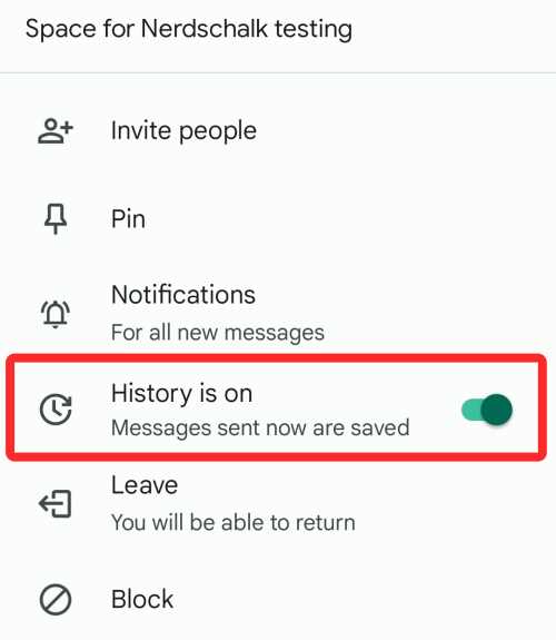In the menu that appears, you can click on ‘Turn on/off history’ to enable or disable Message History for the conversations taking place inside the space.
