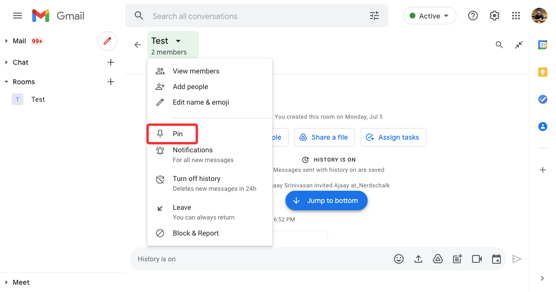 To make sure a particular Space is highlighted and easily accessible inside your Gmail or Google Chat, you can pin a selected Space. For this, enter a Space on Gmail or Google Chat and click on the Space name at the top.