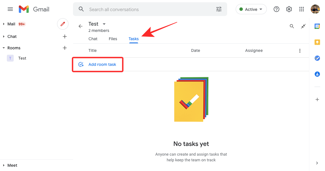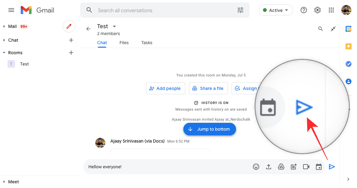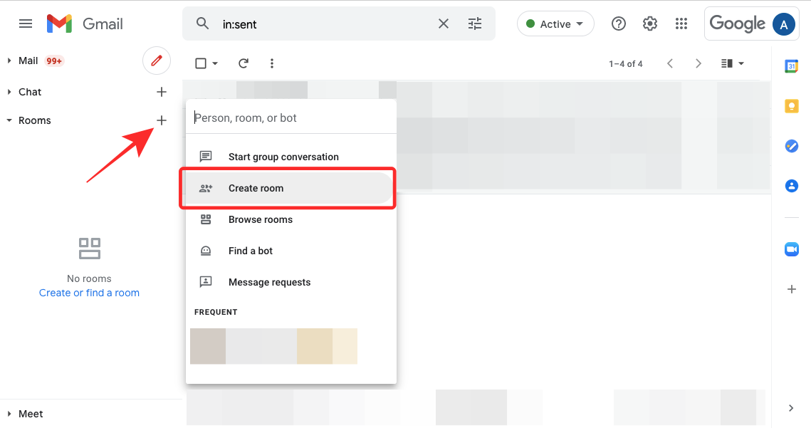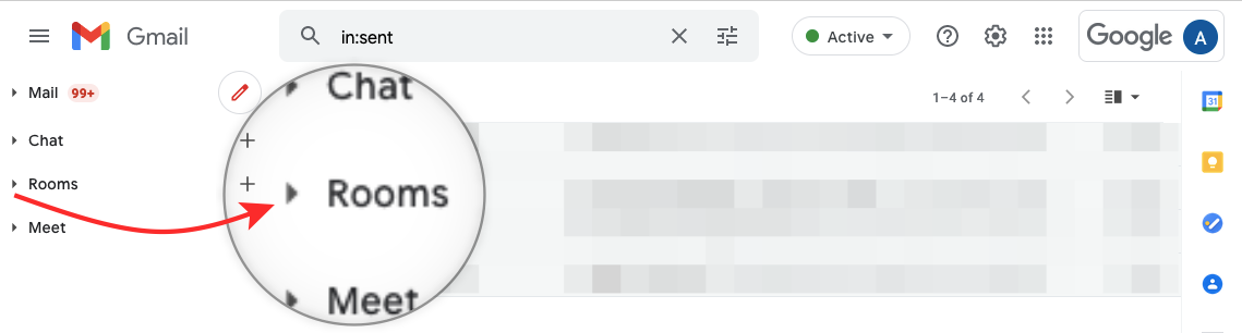 If you haven’t accessed Google Spaces before, it will be minimized on the left sidebar. To expand it, click on the arrow adjacent to the Spaces or Rooms tab.