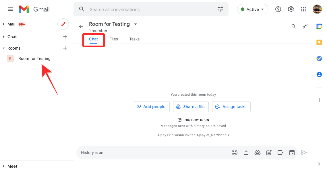 The Gmail screen will now switch to the Space you just entered showing you all the tabs on the left and messages history for the Space on the right panel.