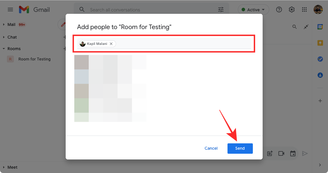 Inside the ‘Add people to Space’ dialog, enter the name or email address of the people you want to invite to the Space, and then click on ‘Send’.