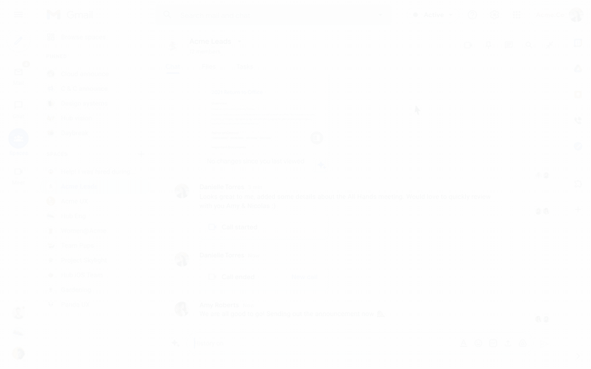 The move came as a means to create this unified experience where you can send emails, chat with others, collaborate on documents, and make video calls within a single browser tab. Within months, the company started rolling out the “integrated workspace” to all G Suite (now Workspace) customers with the following features: