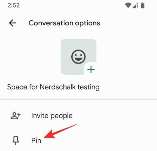 Inside the ‘Conversation options’ screen, tap on the ‘Pin’ option to make sure this space is pinned at the top of your Spaces screen.
