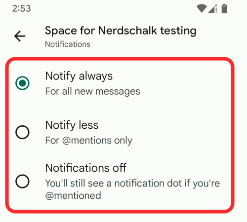 - Notifications off: You won’t get any notifications for messages in the group. Only a notification dot will appear in the Space’s name if you have been @mentioned.