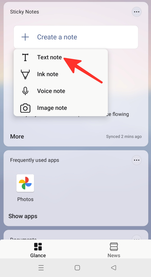 Step 3: Select the type of note you want to create. You can add a text, ink, voice, or image note. We have selected “Text note” in the image given below.