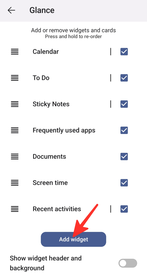 Step 3: From here, you can add or remove widgets and cards. You can also enable “Show widget header and background” if you want. To add widgets, tap on add widget.