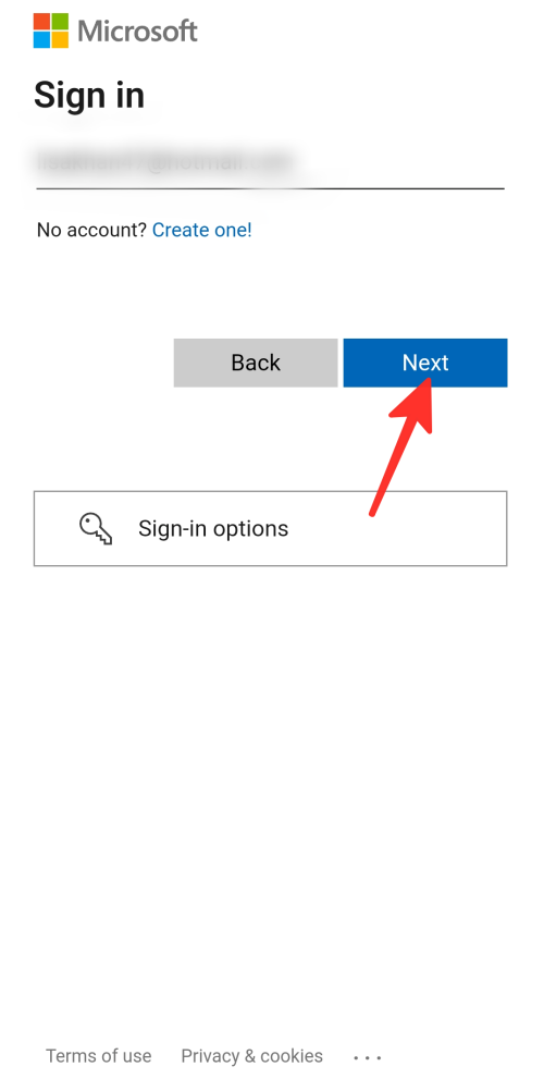 Step 6: Next, the app will ask you to sign in with your Microsoft or business accounts. Enter your account details and tap on Next to continue.