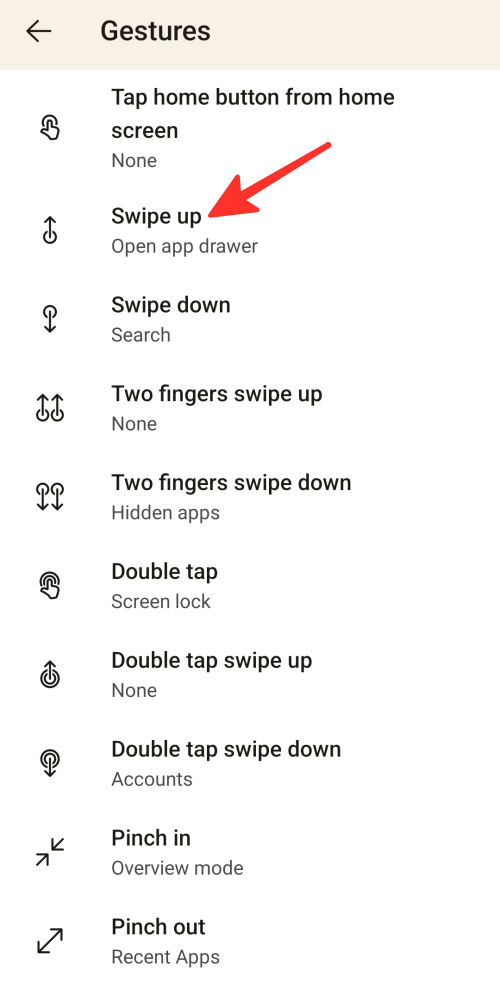 Step 2: You’ll find a comprehensive list of gestures that you can customize to your liking. Tap on the gesture setting you want to change. We have selected “Swipe up” in the image given below.