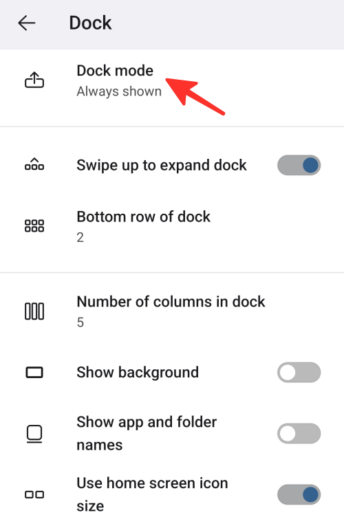Step 4: In addition, you may specify the number of columns in the dock as well as the number of bottom rows. You can also enable or disable “swipe up to expand dock,” “show background,” “show app and folder names,” and “use home screen icon size.”