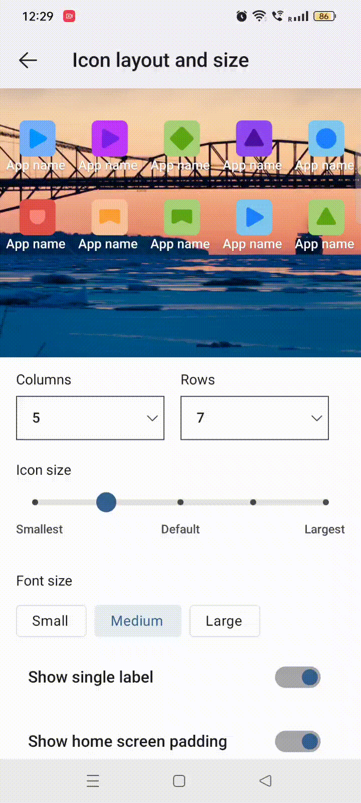 Step 3: From here, you can change the size and layout of the icon. You can select the number of columns and rows on your home screen. In addition, you can also enable “show single label,” “show home screen padding,” “show app and folder names,” “match home screen and dock icons,” and “match home screen and app drawer icons.”