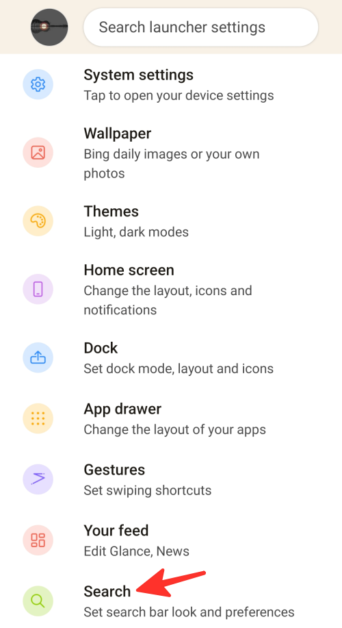 Step 1: Go to Microsoft Launcher’s settings and tap on Search from the list of options.
