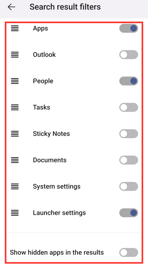 Step 9: Here, you can enable or disable “Apps,” “Outlook,” “People,” “Tasks,” “Sticky Notes,” “Documents,” “System settings,” and “Launcher settings.” You can also enable “Show hidden apps in the results” option.