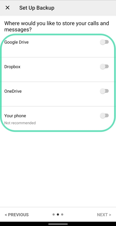Step 8: On the next page, select the storage you want to back up your text messages to. You can choose between Google Drive, Dropbox, OneDrive, and device storage. Selecting ‘Your Phone’ will save the backup on your internal/external storage.