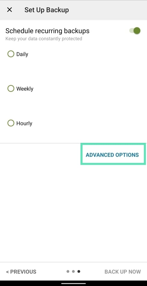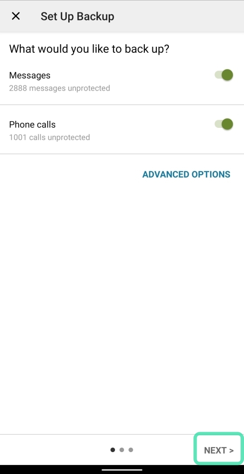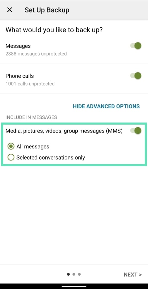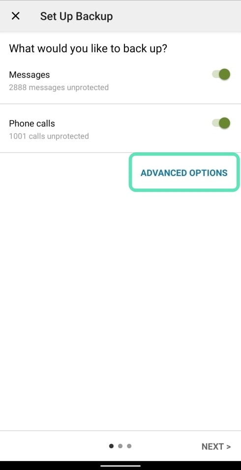 You can additionally backup call logs, media, and group messages by tapping on Advanced Options.