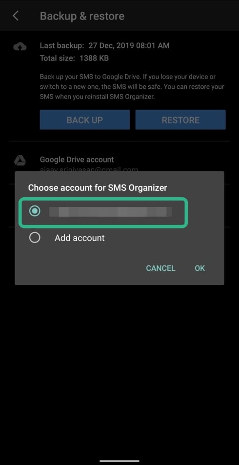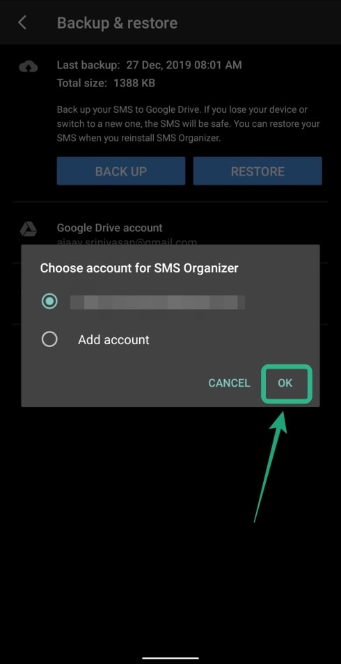 Step 8: Select the Google account you want the app to use to backup your text messages and tap OK.