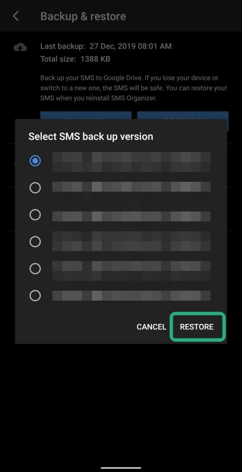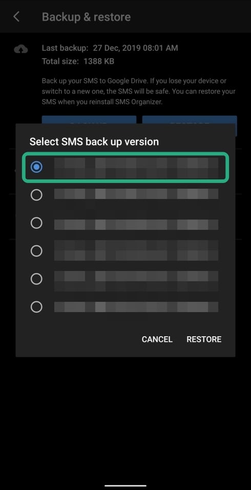 Step 6: Select a recent backup from the list you want to retrieve texts from.