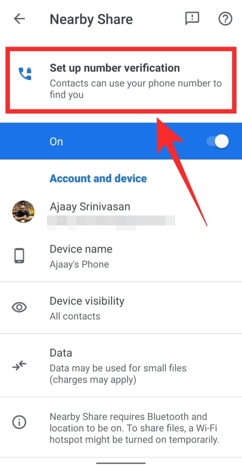 When you set up Nearby Share for the first time, you will be prompted to set up number verification on your phone. When verification is complete, your contacts will be able to share files using your phone number instead of just your email address.