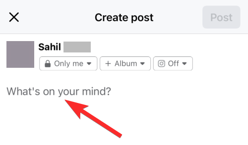 On your profile homepage, click on the typing area marked by the text “What’s on your mind?”.