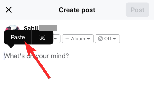 Tap and hold on the typing area marked by the text “What’s on your mind?”.