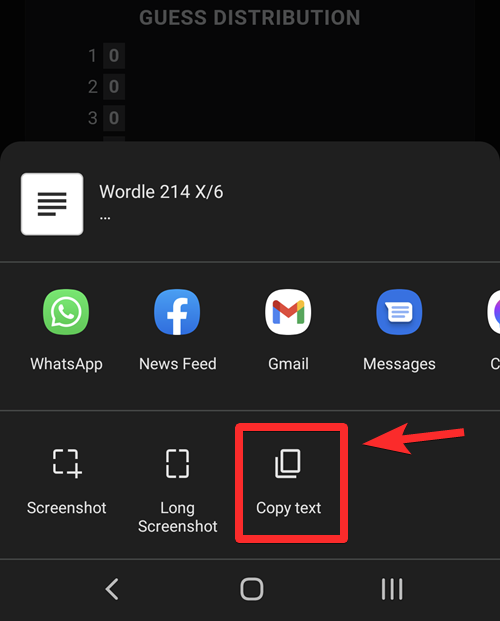 Tap Copy text. This will copy the Wordle result to your device’s clipboard. No need to worry about accessing your device’s clipboard, BTW.
