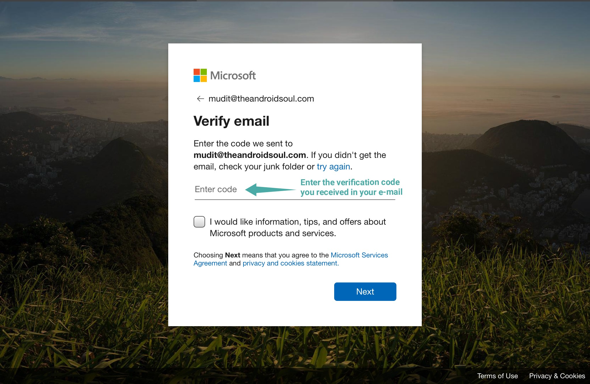Step 4: Check your inbox. You must have received an email containing a verification code from Microsoft. Enter this code in the Verify email box as shown below.