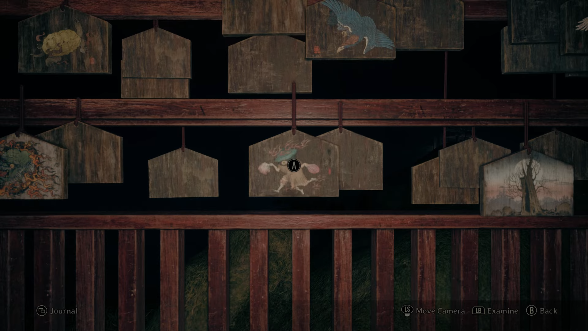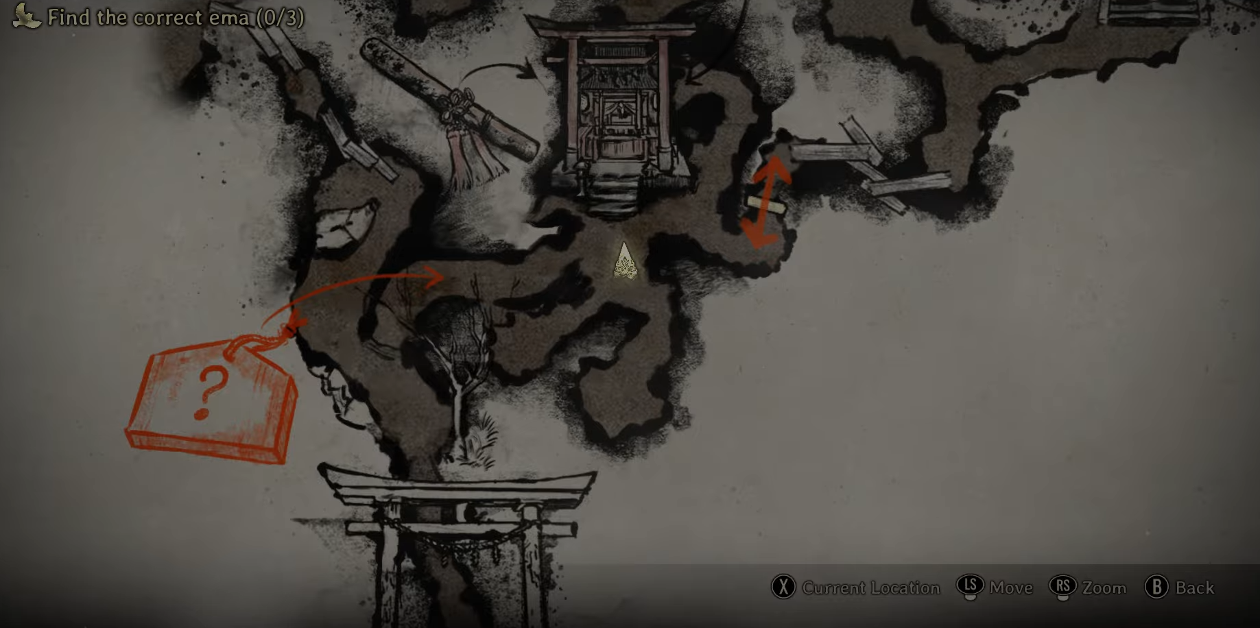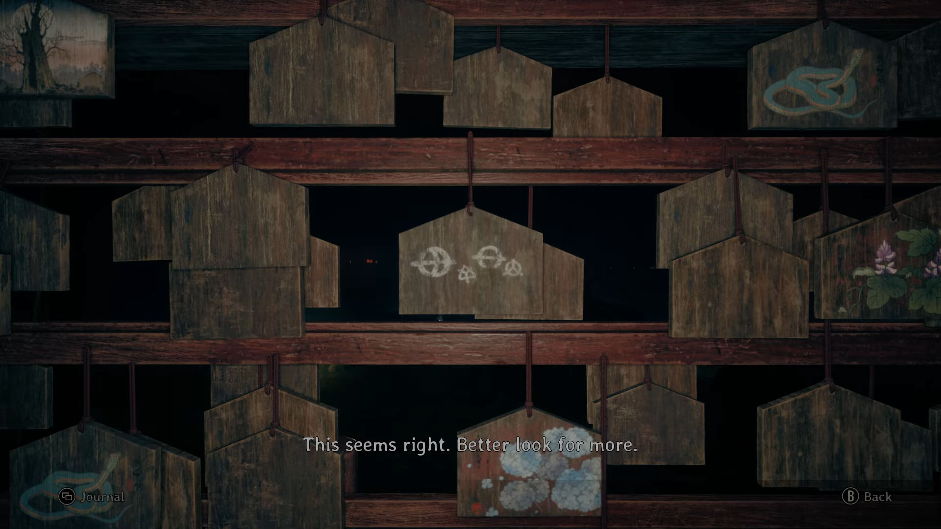When you reach the Shrine Vault on the Dark Shrine Path, you’ll find a padlock requiring three symbols. To unlock it, you first need to retrieve the correct ema plaques in the surrounding area. Each of those ema, when flipped or inspected, show multiple symbols. The riddle from your journal tells you which symbol (among those options) is the “correct” one for each ema.