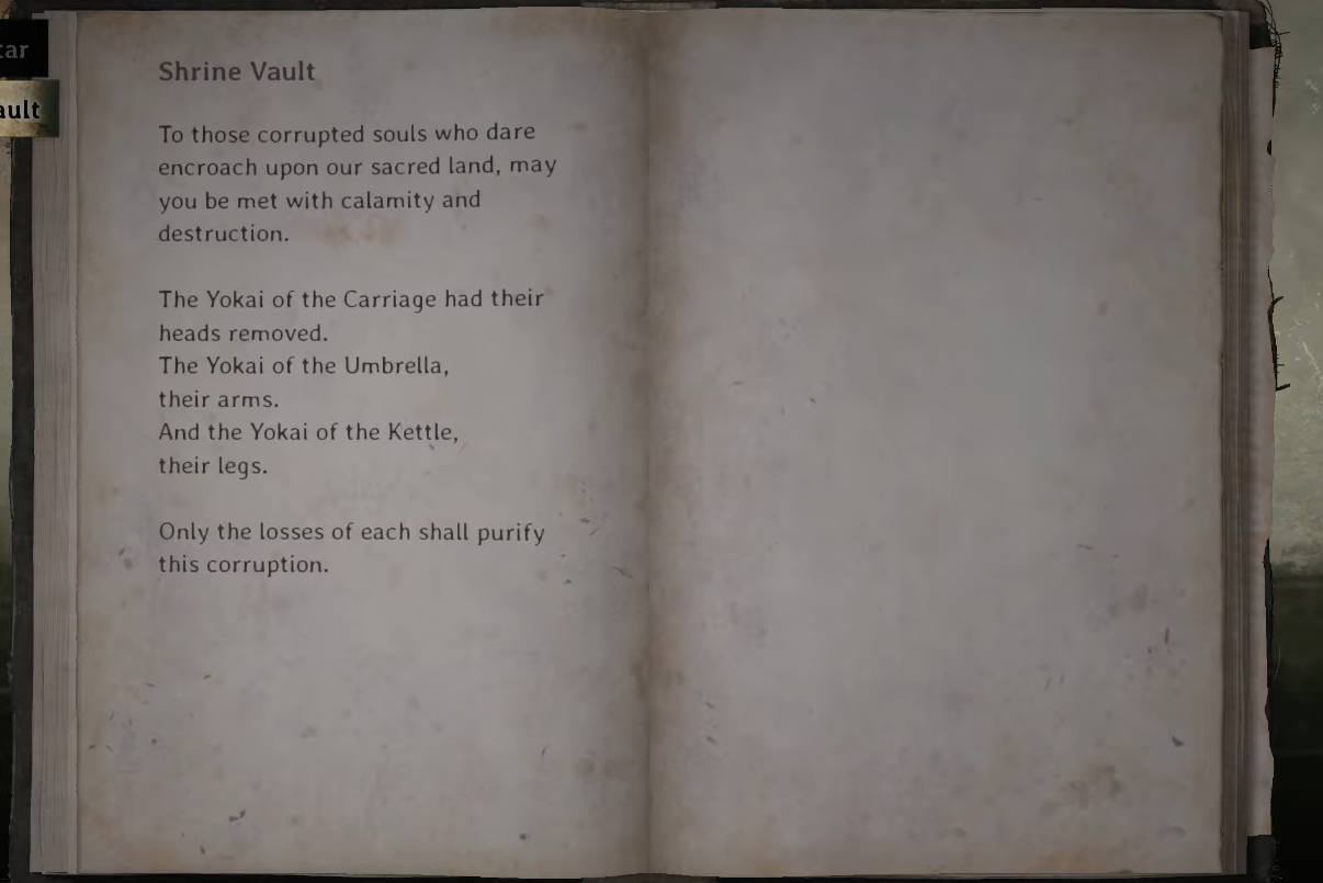 "The Yokai of the Carriage had their heads removed. The Yokai of the Umbrella, their arms. And the Yokai of the Kettle, their legs."