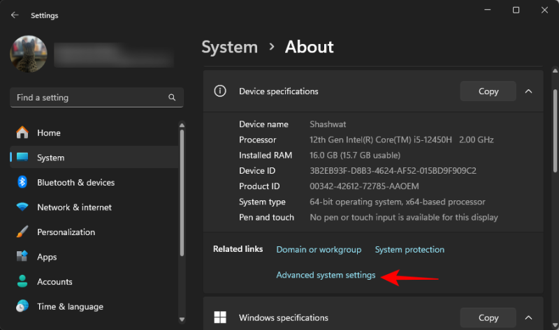 Step 3a: In the ‘Device specification’ section, click on the Advanced system settings related link.