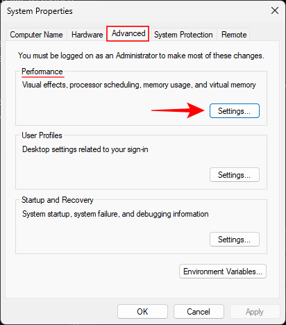 Step 4: In the ‘Advanced’ tab, click on Settings in the ‘Performance’ section.