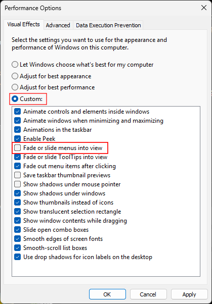 - Go to the Settings app > System > About > Advanced system settings > ‘Performance’ Settings > Custom > uncheck Fade or slide menus into view.
