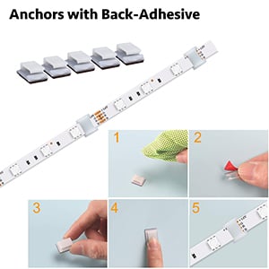 The package not only comes with strong back-adhesive on the back of the LED strip but also comes with hooks with strong back-adhesive. You can use these hooks to fix the strips at corners or places that do not stick well. All adhesive tapes are designed for one-time use. So, please plan the route before tearing off the protective layer of the double-sided adhesive tapes. The adhesive can lose stickiness after exposure to the air or dust for some time.