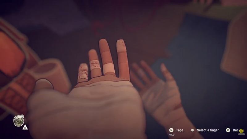Once you choose to tape your fingers, the game shifts into a brief interactive action rather than a simple button press. You hold the confirm button and rotate the left stick in a smooth circular motion to wrap the tape. The motion is slow by design, matching the game’s deliberate pacing and physical tone.